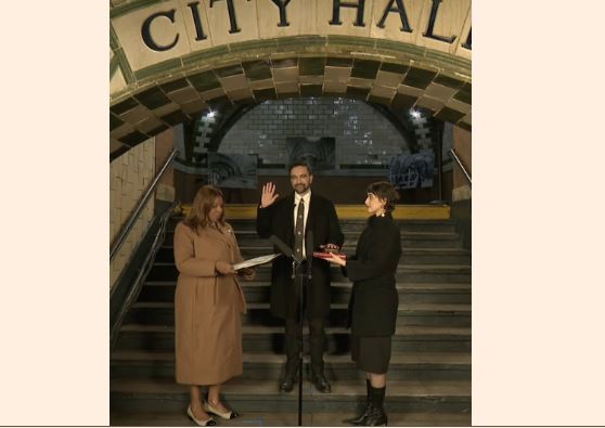 The ceremony, administered by New York Attorney General Letitia James, a political ally, took place at the old City Hall station, one of the city’s original subway stops that is known for its stunning arched ceilings.